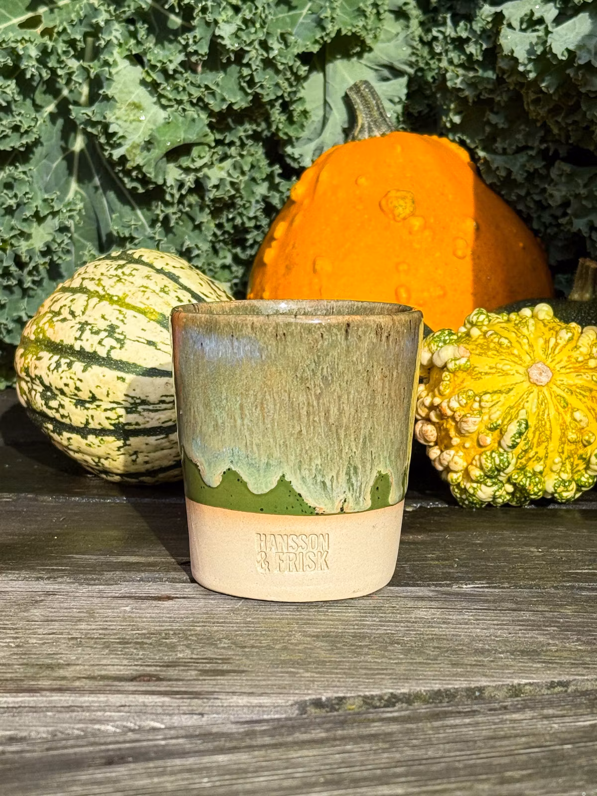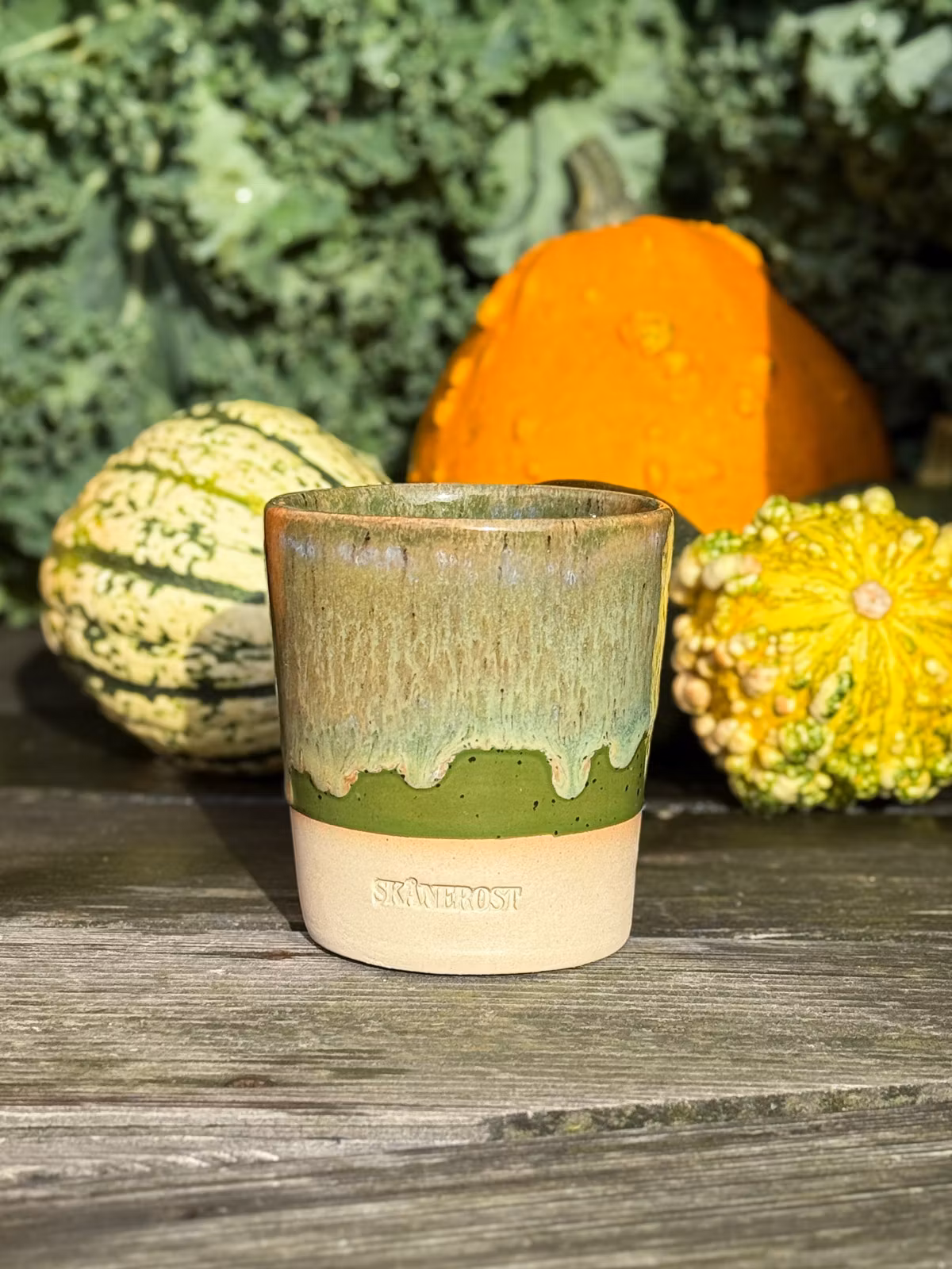 Grön bottenglasyr med beige rinnande glasyr med blå skiftningar ovanpå.