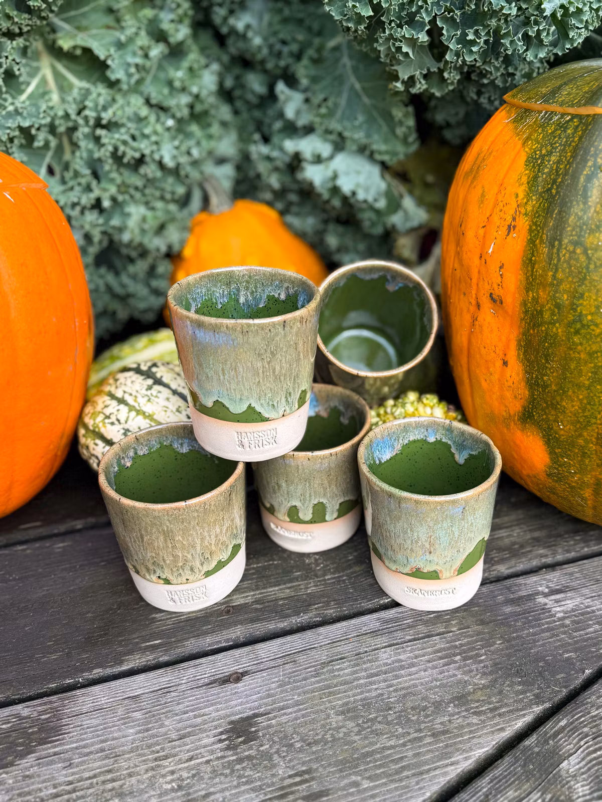 Unika, handgjorda muggar från vår ateljé i Munka Ljungby, Skånerost loggan på ena sidan, Hansson & Frisk på andra sidan.