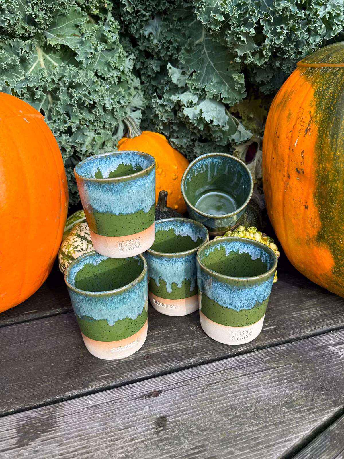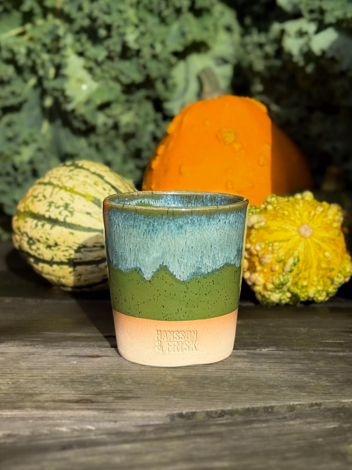 Unika, handgjorda muggar från vår ateljé i Munka Ljungby, Skånerost loggan på ena sidan, Hansson & Frisk på andra sidan.