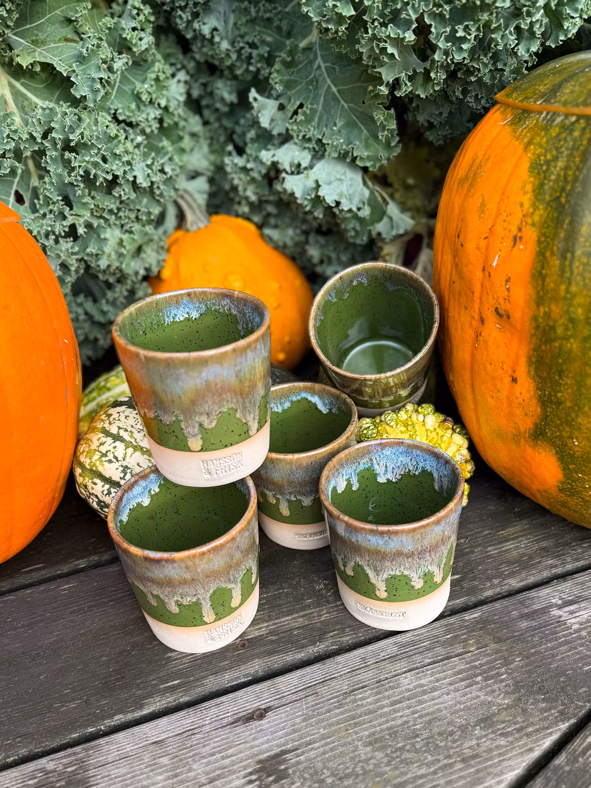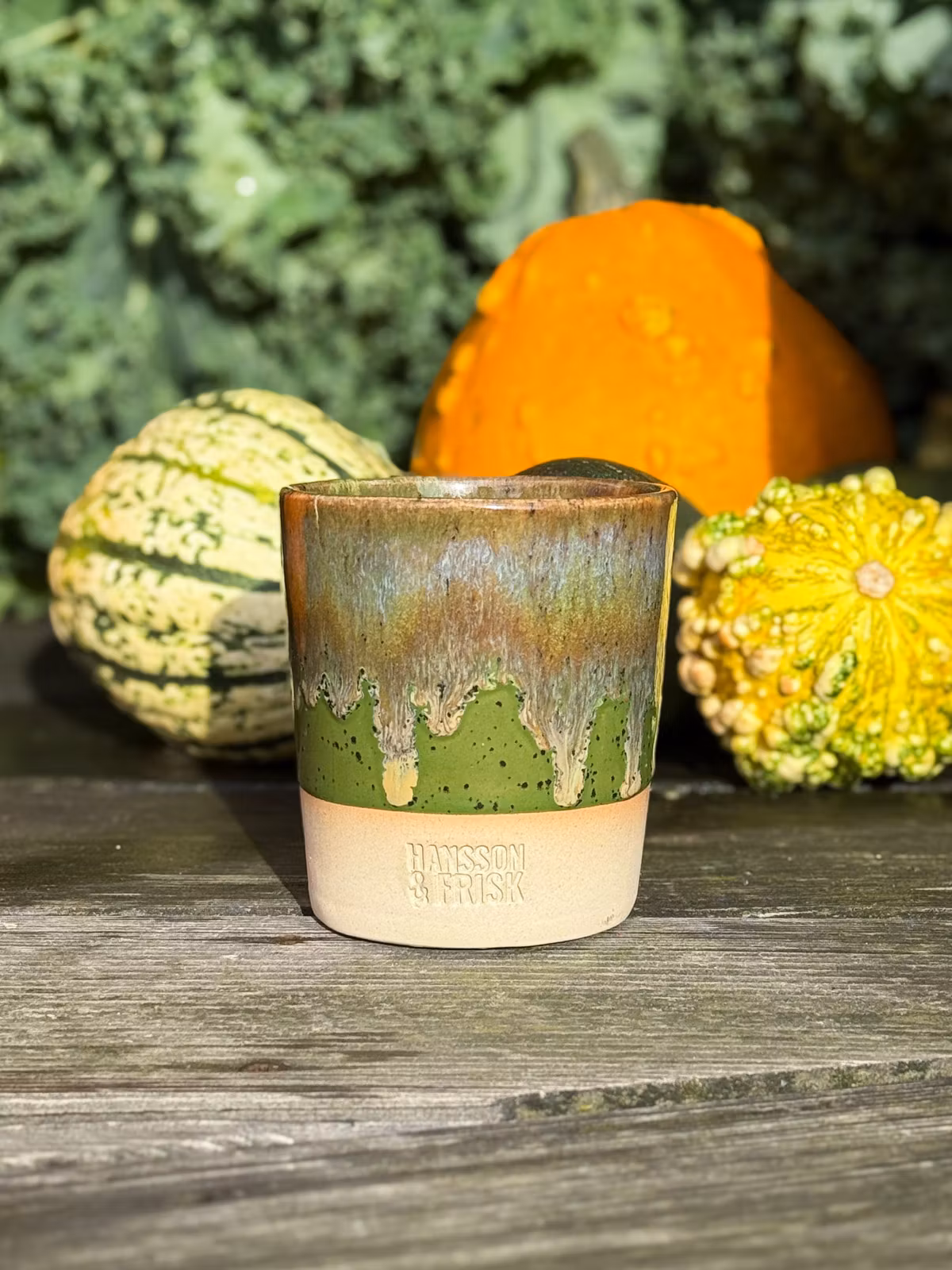 Unika, handgjorda muggar från vår ateljé i Munka Ljungby, Skånerost loggan på ena sidan, Hansson & Frisk på andra sidan.