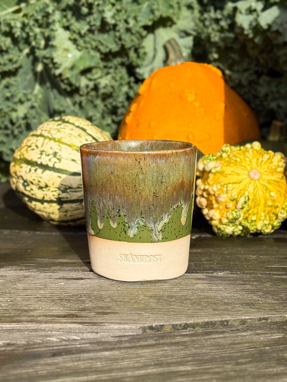 Grön bottenglasyr, brun rinnande glasyr med blå skiftningar ovanpå.