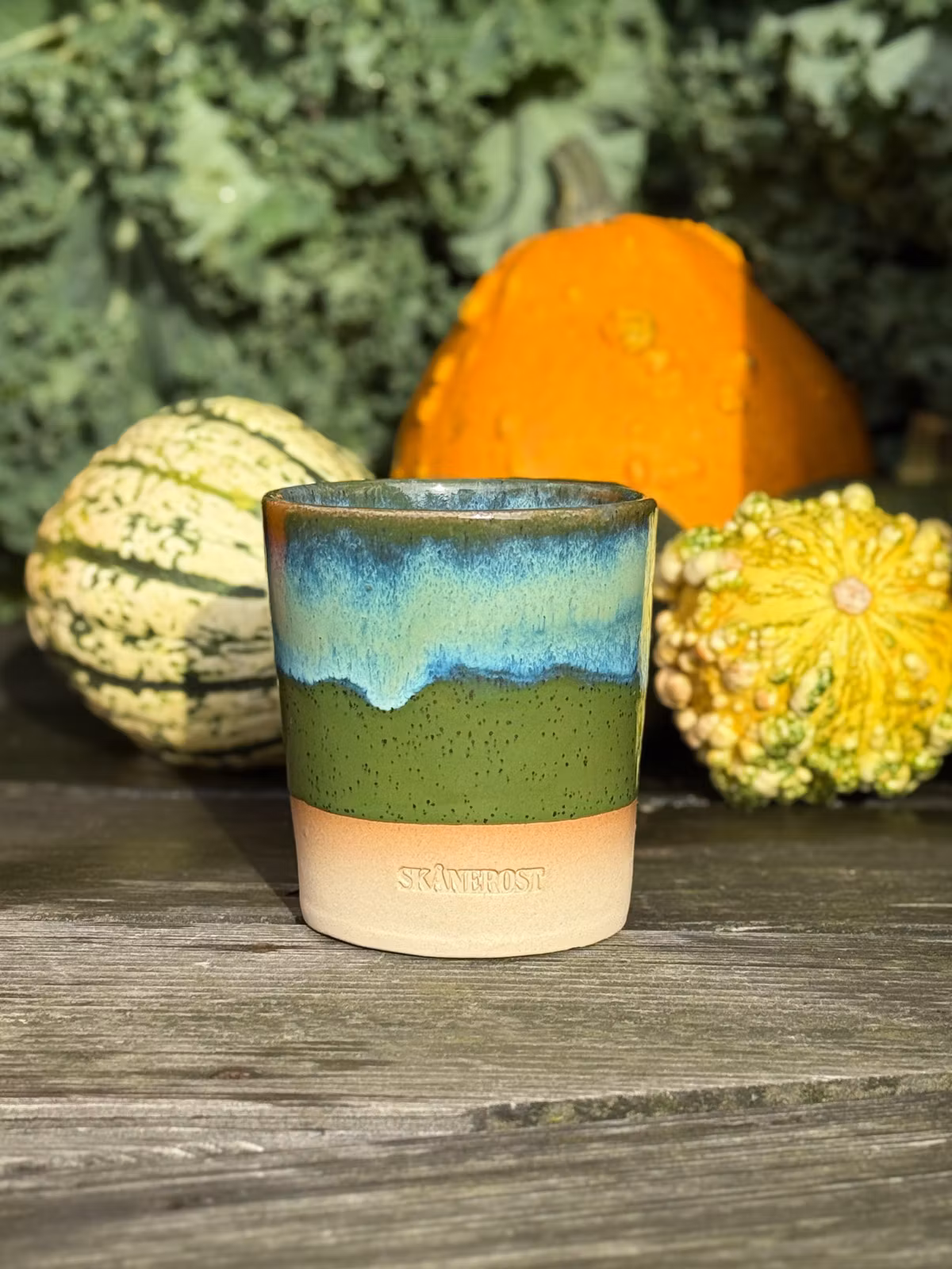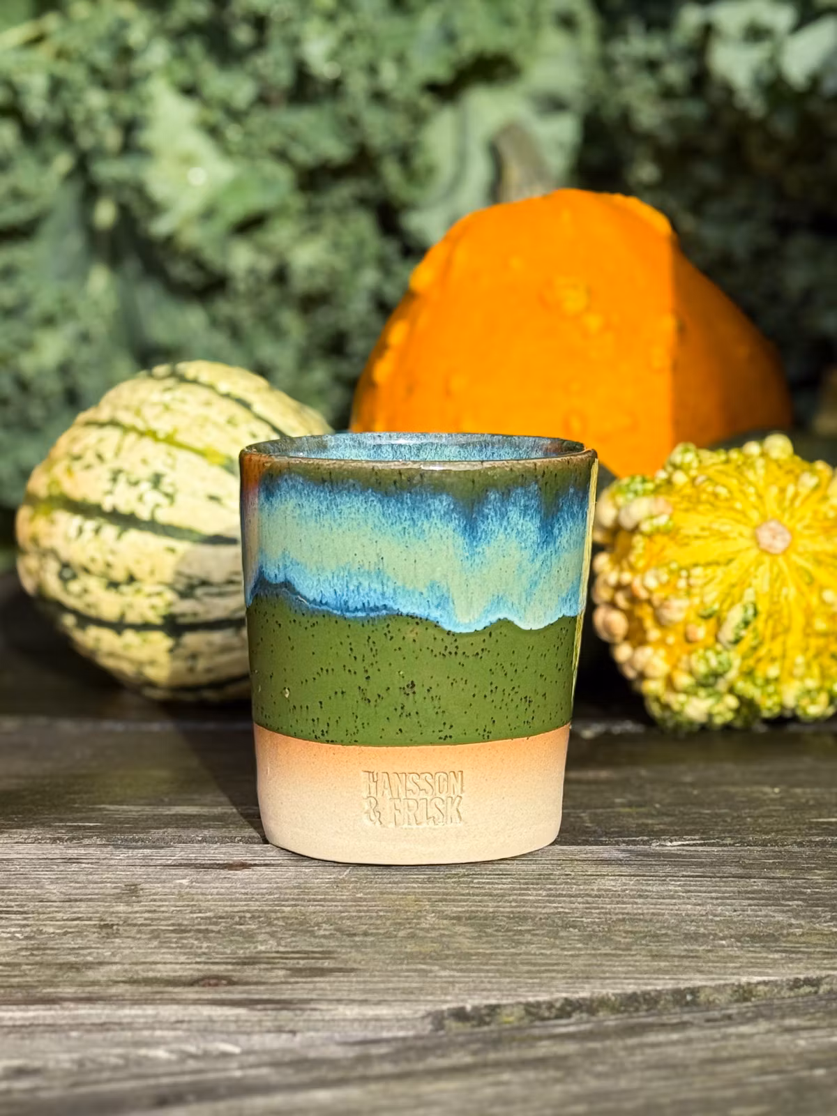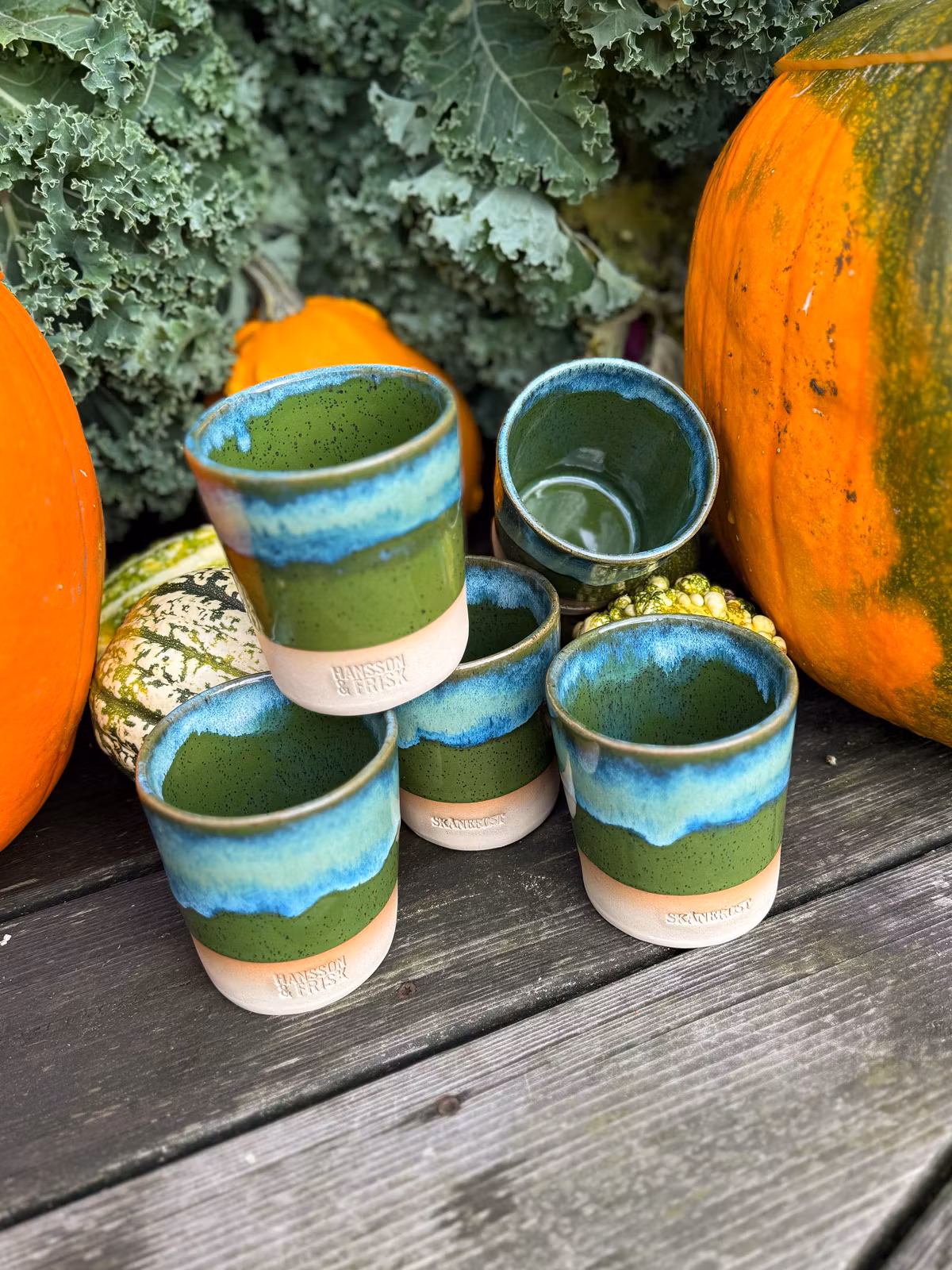 Unika, handgjorda muggar från vår ateljé i Munka Ljungby, Skånerost loggan på ena sidan, Hansson & Frisk på andra sidan.