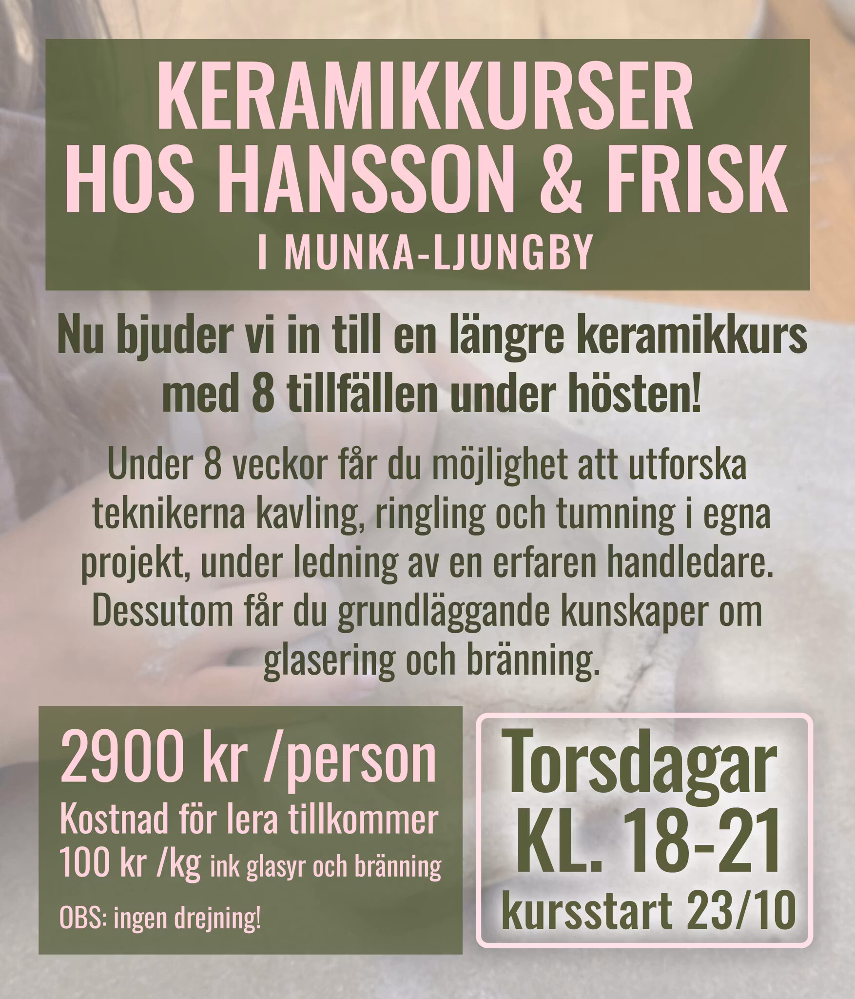 8 veckors kurs i keramik hos Hansson & Frisk TORSDAGAR kl. 18-21